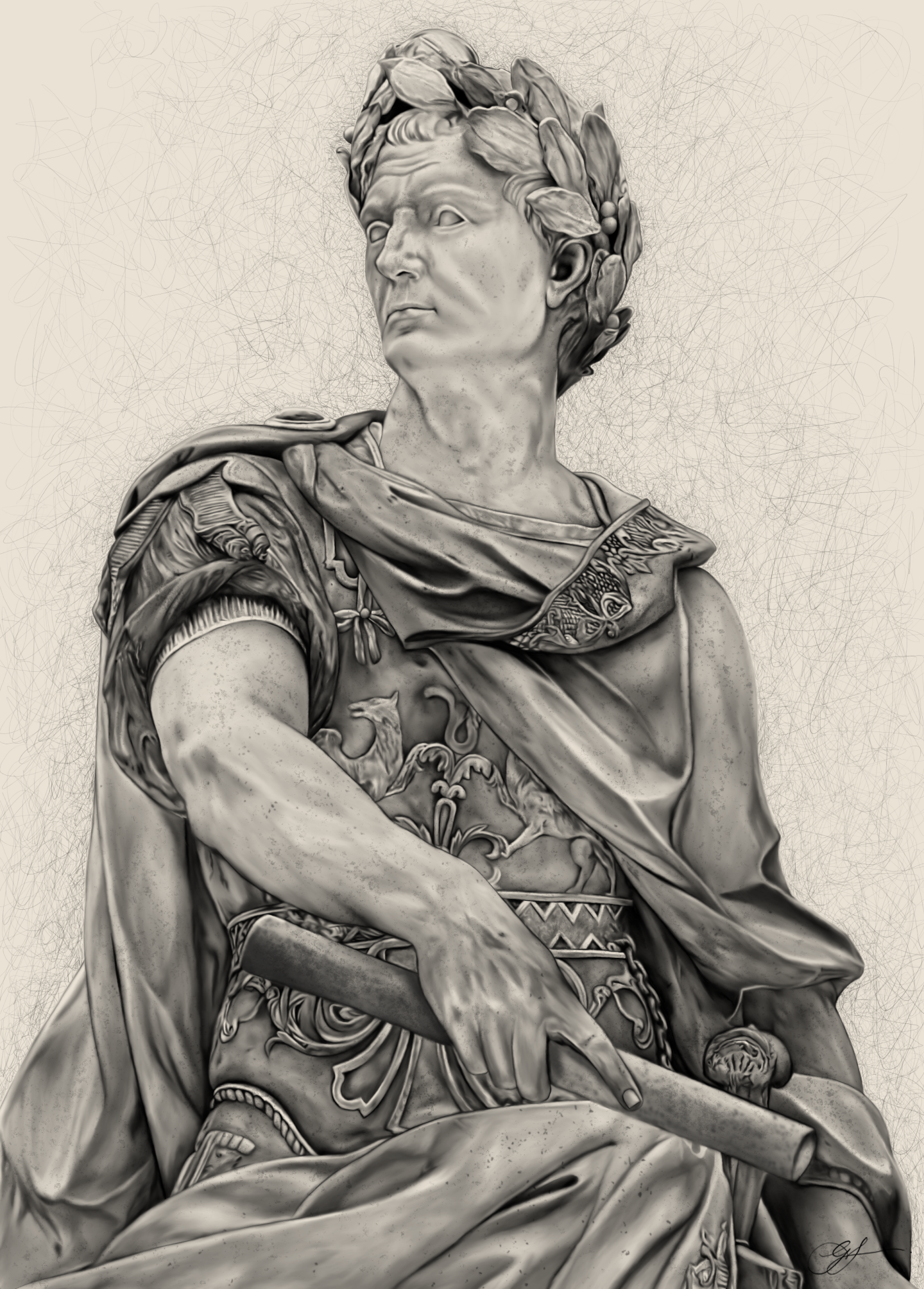 This drawing is based on the statue of Julius Caesar, commissioned in 1696 for the Gardens of Versailles to accompany Annibal by Sébastien Slodtz. The sculpture itself is attributed to Nicolas Coustou, and it occupies a different kind of presence to more overtly expressive works. There is no visible struggle, no dramatic gesture forcing itself outward.